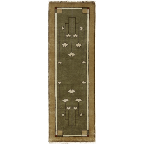 The Ginko Rug design is an Arts & Crafts classic. The botanical elements of the asiatic ginkgo leaf join with the ordered geometry of the Prairie Style for a strikingly simple effect that is timeless in it's design. In shades of camel, sage, and oatmeal with burgundy and dark brown accents. The field is deep sage.
